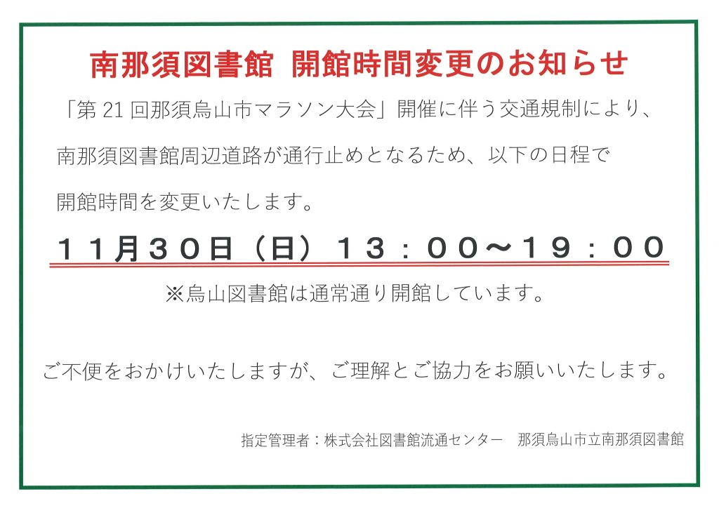 2025年11月4日 / 最終更新日 : 2025年11月4日 karasuyama 南那須図書館 【重要】南那須図書館 11/30(日)開館時間変更のお知らせ 「第21回那須烏山市マラソン大会」開催に伴う交通規制により、 下記のとおり開館時間を変更いたします。 ご不便をおかけいたしますが、ご理解とご協力をお願いいたします。