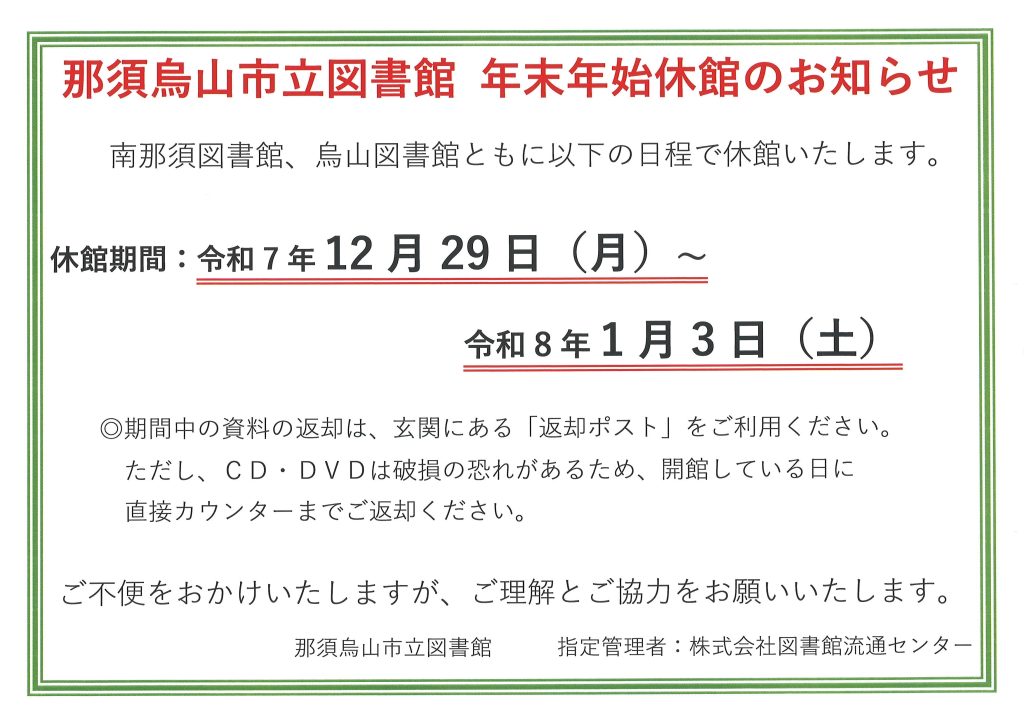 南那須図書館、烏山図書館ともに、下記の通り休館いたします。
