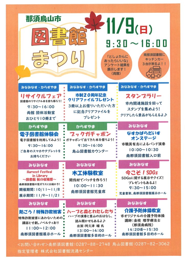 2025年10月25日 / 最終更新日 : 2025年10月25日 karasuyama 催し物 図書館まつり開催のお知らせ 開催日: 2025年11月9日 09:30 - 16:00カテゴリー: 催し物 11月9日(日)図書館まつりを開催します。 楽しいイベントが盛りだくさん!ぜひご来館ください♪