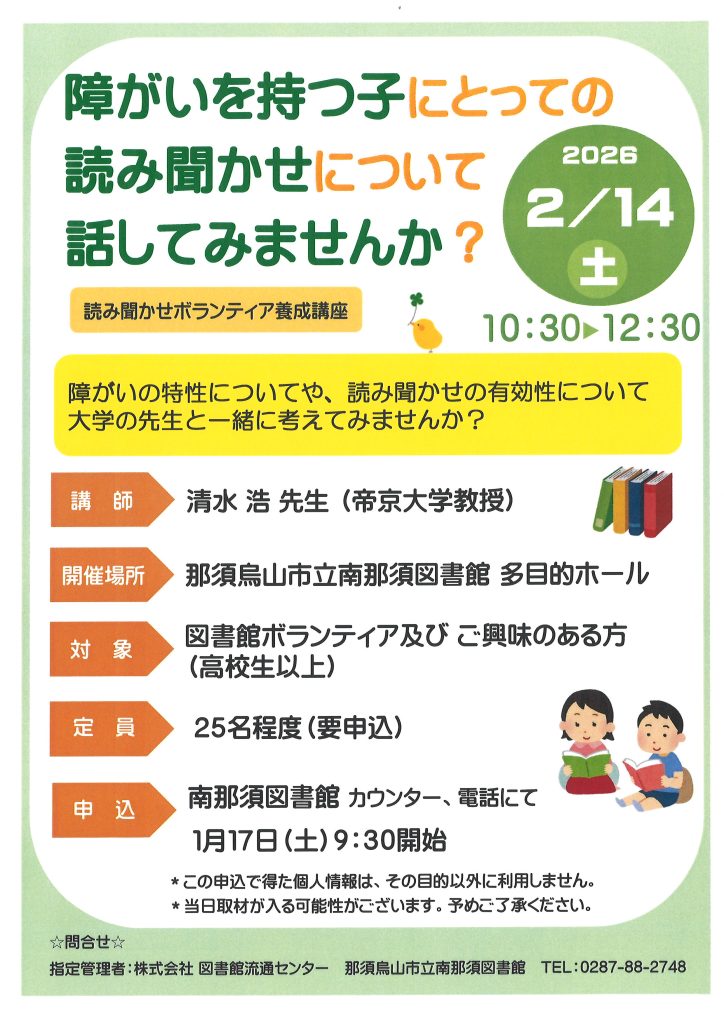 2026年1月15日 / 最終更新日 : 2026年1月15日 karasuyama 催し物-南那須図書館 読み聞かせボランティア養成講座 開催日: 2026年2月14日カテゴリー: 催し物-南那須図書館 障がいを持つ子にとっての読み聞かせについて話してみませんか? みなさまのご参加をお待ちしています!